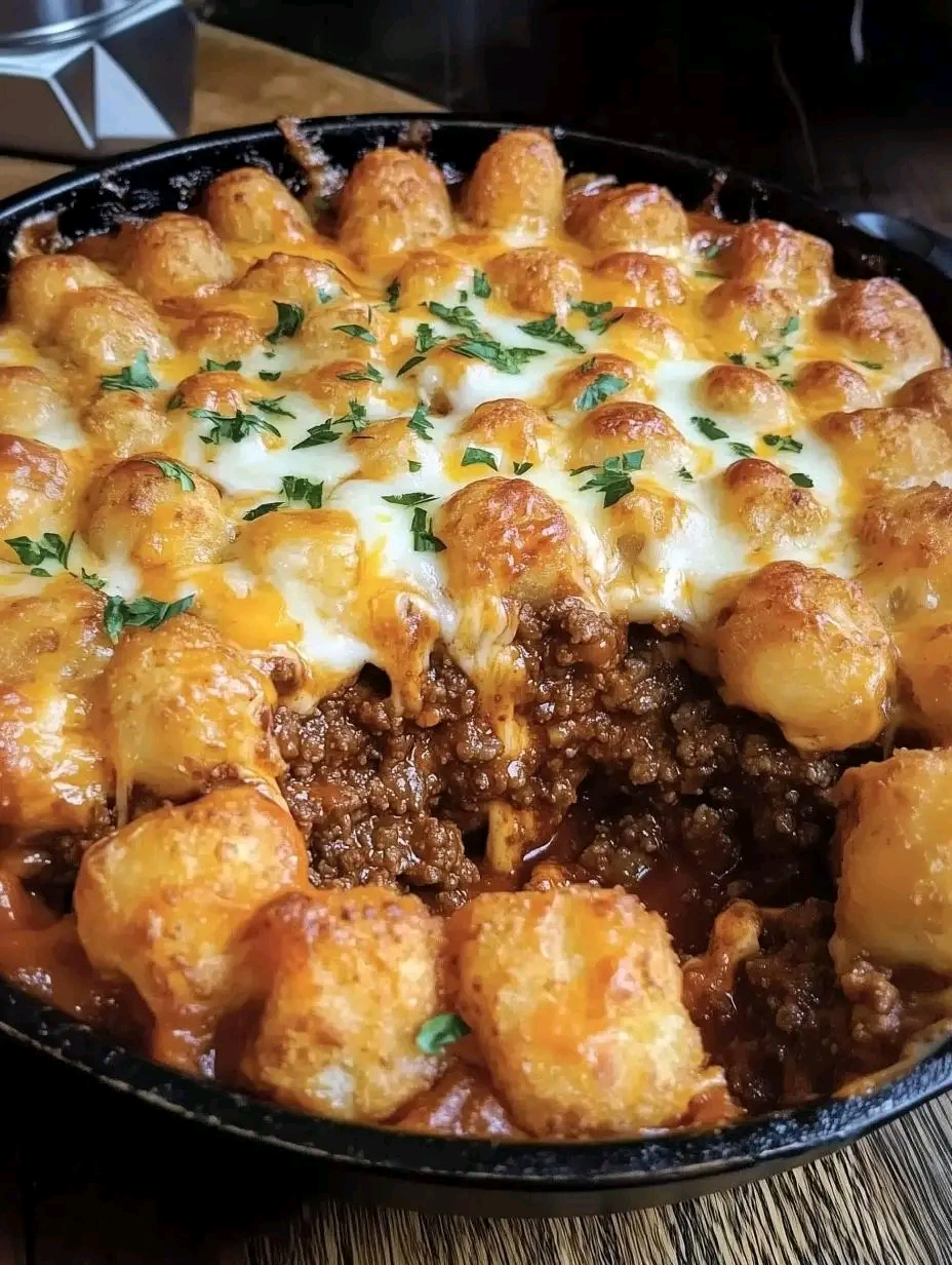 Ultimate comfort food mashup with tangy beef, melted cheese, and crispy tater tots all in one pan!