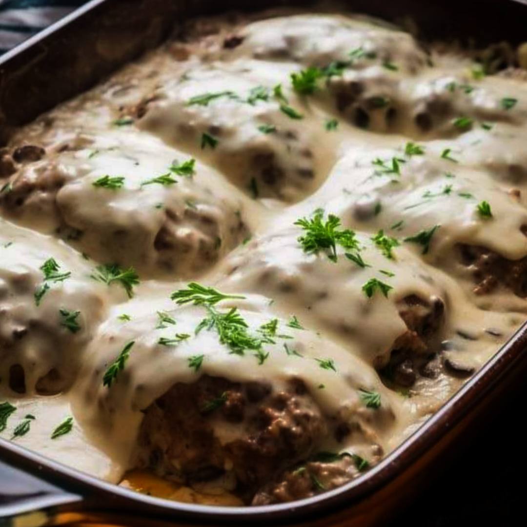 5. Arrange the cut onion rings in a baking dish and top with the browned hamburger steaks.