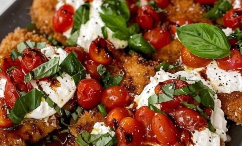 This dish is perfect for a light dinner or a special weekend meal. Enjoy the combination of crispy chicken with the creamy burrata and fresh, flavorful toppings!