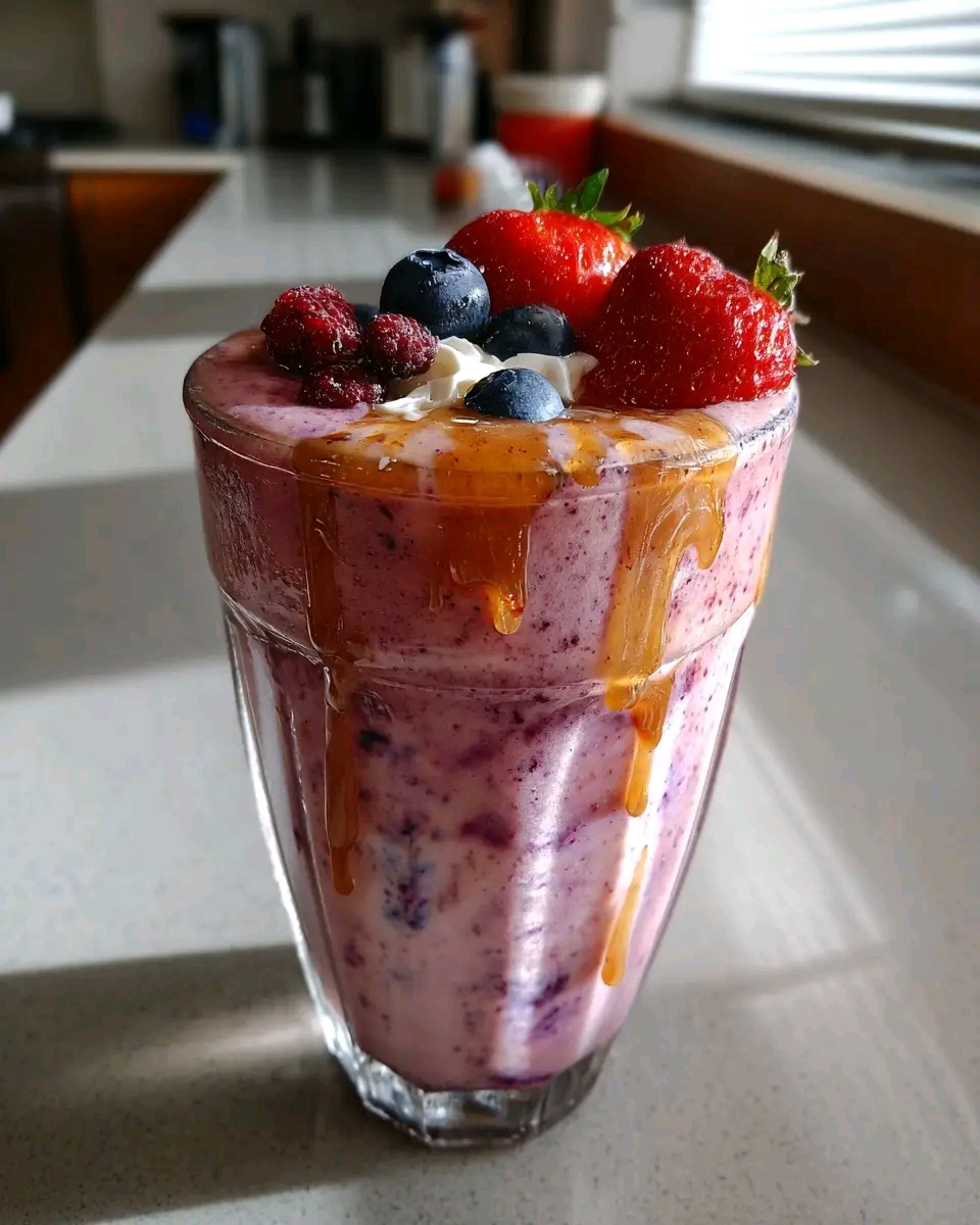 Ingredients: ripe banana, fresh or frozen strawberries, Greek yogurt, almond milk, a little honey. Blend until smooth. Texture: creamy, sweet, slightly tangy from yogurt and strawberries.