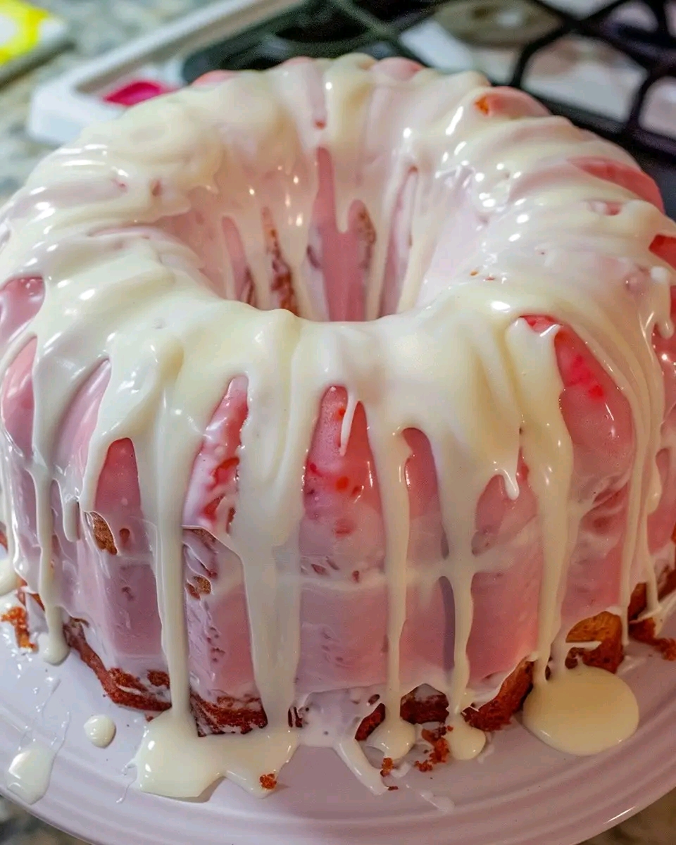 optional strawberry cream cheese glaze combine softened cream cheese and butter, blend in powdered sugar, strawberry puree or fruit spread, vanilla, adjusting with milk as needed to reach pourable consistency then drizzle over the cooled cake for show-stopping finish that’s both decorative and delicious