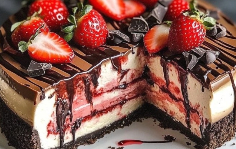 This layered strawberry chocolate cheesecake is perfect for special occasions or as a show-stopping dessert for any gathering!