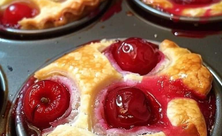 – Spoon about 1-2 tablespoons of cherry pie filling into each dough-lined muffin cup.
