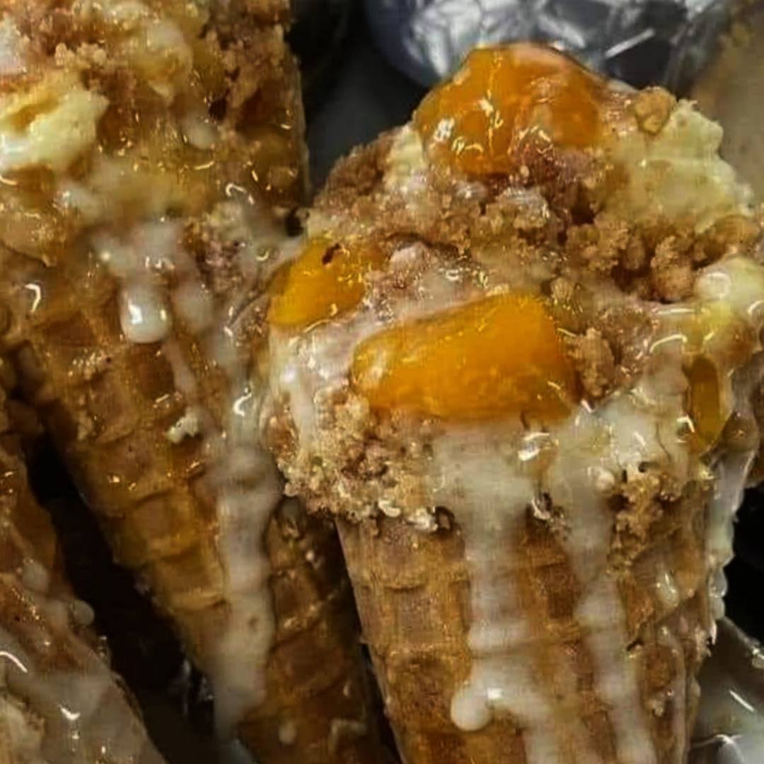 After whipping the cream, gently incorporate it into the cheesecake mixture. Scoop the cheesecake and cobbler into a cone in alternating spoonfuls. Finish it off with a chocolate drizzle and some crumbled cookies on top.