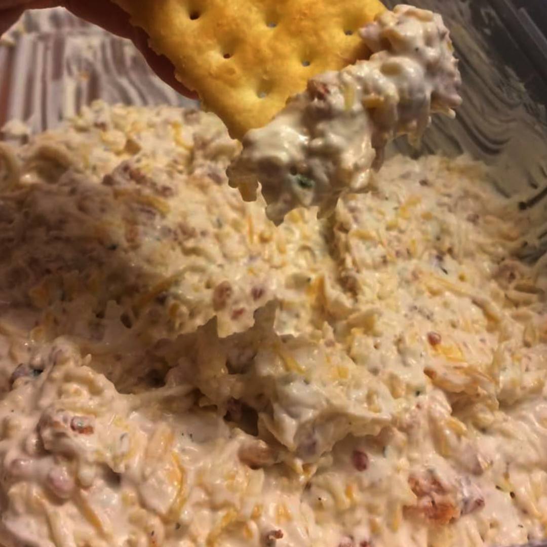 Just mix all of that together and viola, your dip is done. It looks kind of like throw up but I promise it’s amazing. What I do is add the sour cream and then mix in the ranch. After mixing those together I add in the bacon bits and stir. And after all of that is stirred together I mix in the entire thing of cheese.